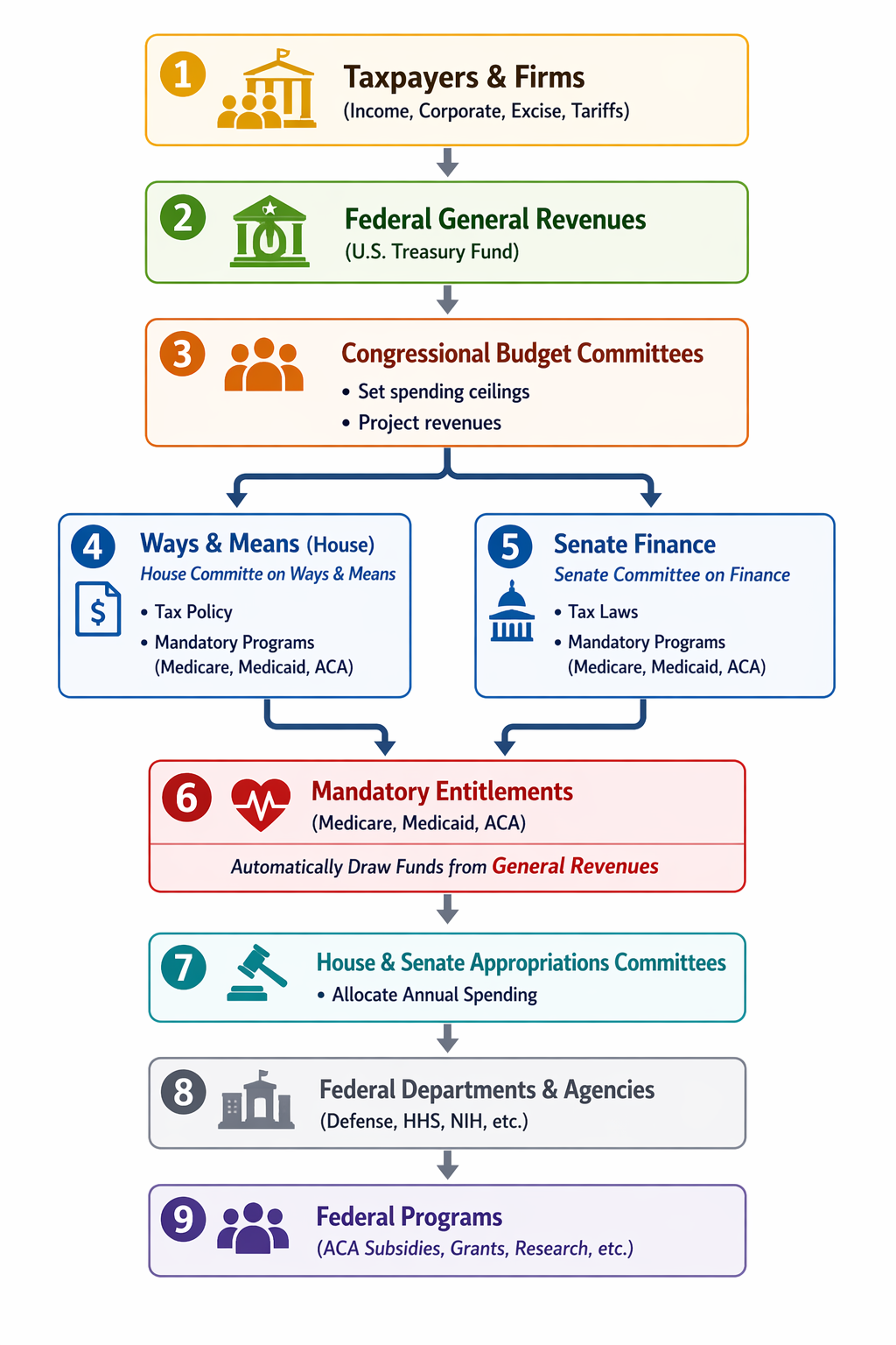 This flowchart shows how money collected from taxpayers and businesses flows through the federal government before being spent on programs such as Medicare, Medicaid, and Affordable Care Act (ACA) subsidies. Taxes on income, corporations, and certain goods first go into the U.S. Treasury’s general revenue pool, which functions as the government’s main operating fund. From there, Congress sets the overall fiscal framework through its Budget Committees, which estimate revenues and establish spending targets. Key committees—particularly the House Ways and Means Committee and the Senate Finance Committee—write the laws that govern taxes and mandatory programs such as Medicare, Medicaid, and ACA subsidies. Because these programs are considered mandatory entitlements, the spending occurs automatically once the law defines who qualifies and how much they receive.