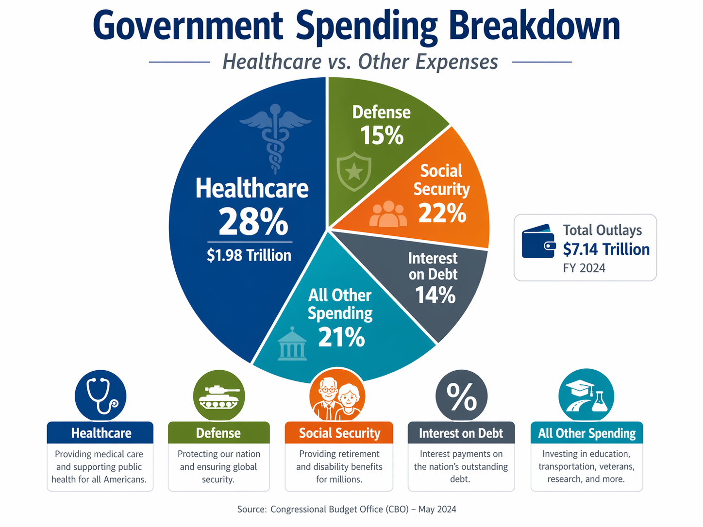 The overall government budget in this pie chart shows just how large healthcare has become within the federal fiscal picture. In FY2025, total federal outlays were about $7.01 trillion, and Health plus Medicare accounted for roughly $1.98 trillion, or about 28% of all federal spending. That puts healthcare in the same tier as the government’s other biggest obligations, including Social Security, net interest on the debt, and national defense. The challenge is straightforward but profound: when one category consumes more than a quarter of total federal spending, even modest cost growth can place enormous pressure on taxpayers, deficits, and the government’s ability to fund other priorities.