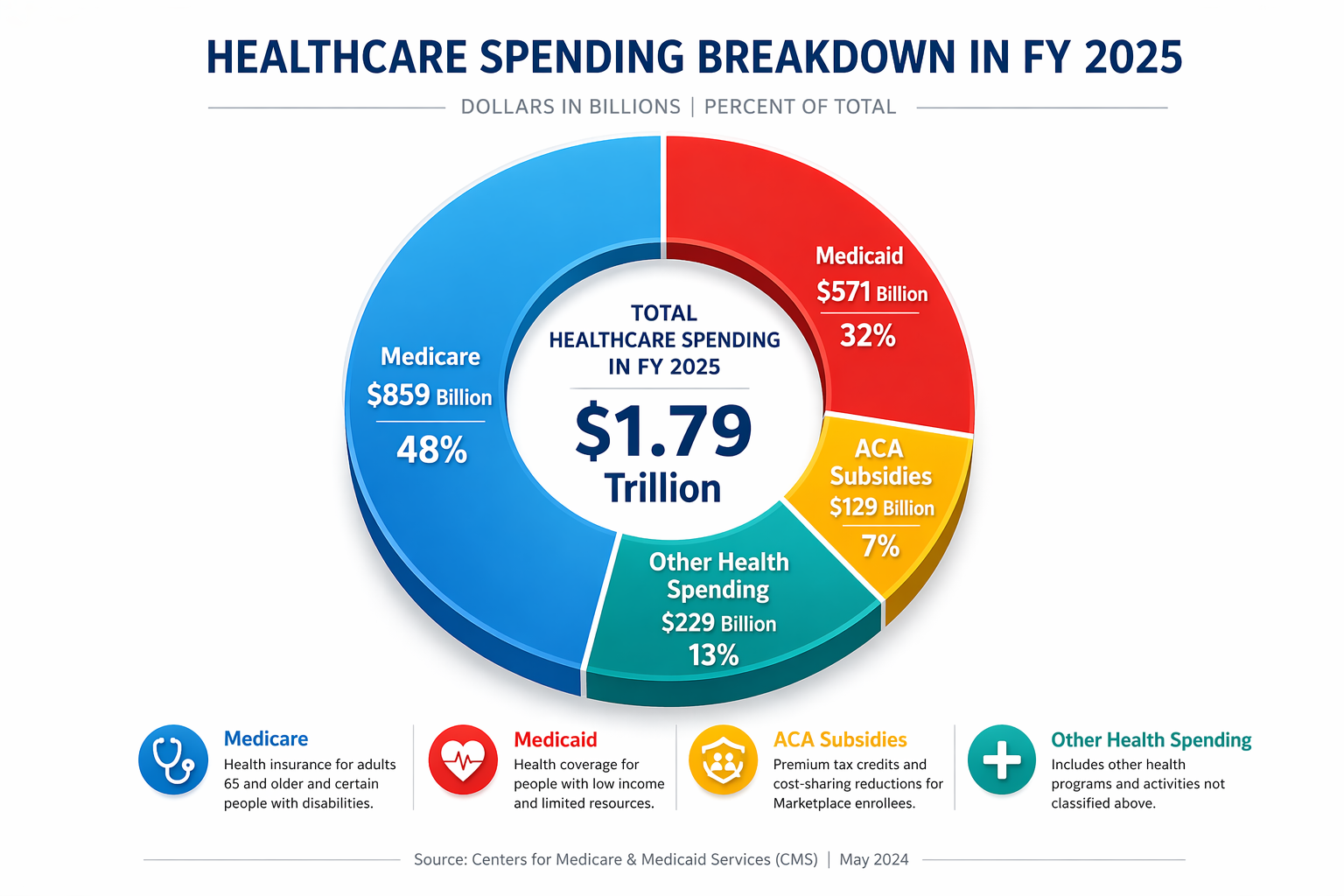 Before diving into how the Affordable Care Act is funded, it helps to step back and look at the broader fiscal picture. Federal healthcare spending is now one of the largest components of the U.S. budget, competing with Social Security, defense, and interest on the debt for limited public dollars. That reality shapes every ACA funding debate. The law’s subsidies may represent only one part of total healthcare spending, but they sit inside a much larger and more expensive system—one in which even relatively modest policy changes can affect federal deficits, insurance affordability, and coverage for millions of Americans.