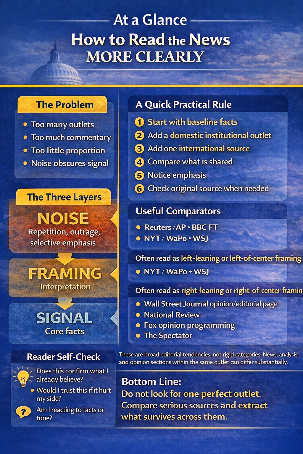 A more honest conclusion is this: readers cannot eliminate bias, noise, or institutional incentives entirely. But they can become more disciplined. They can slow down. They can distinguish reporting from persuasion. They can compare serious outlets with different tendencies. They can look for the shared factual core. And they can become more suspicious of stories that seem perfectly tailored to confirm what they already wanted to believe.