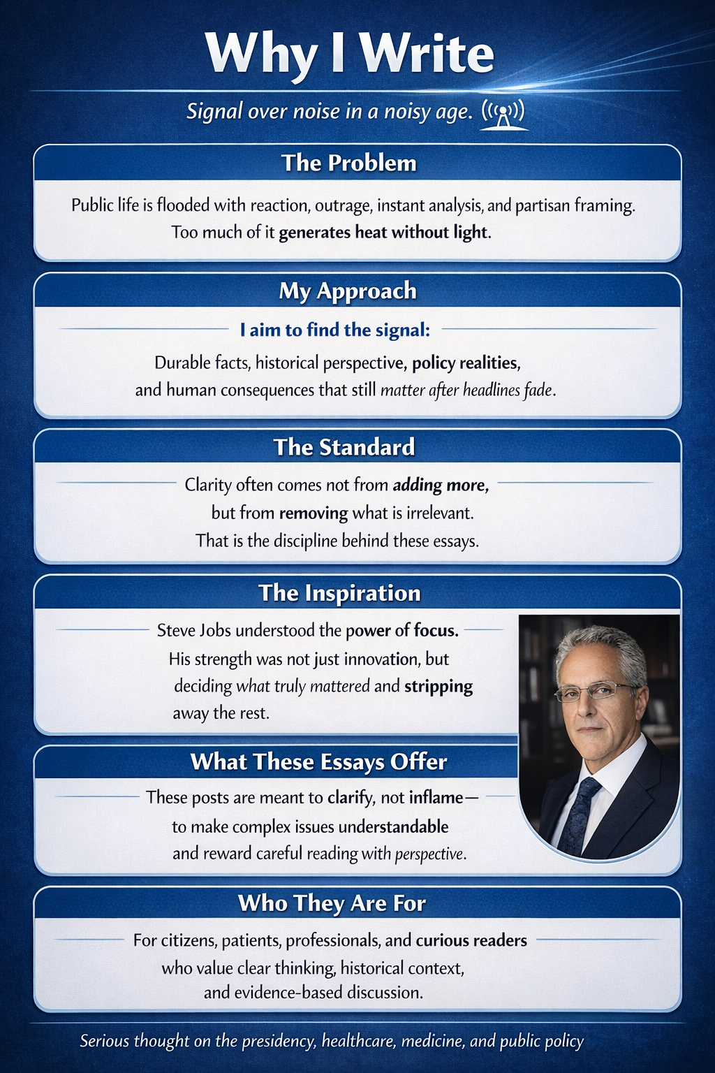 In an age of constant reaction, my essays are guided by a simple principle: the signal-to-noise ratio matters. Public life is saturated with commentary, outrage, instant analysis, and partisan framing, much of it designed to provoke rather than clarify. The result is noise—volume without depth, heat without light. My goal is different. I try to identify the signal: the durable facts, historical patterns, policy realities, and human consequences that remain meaningful after the headlines fade. Whether the subject is the presidency, healthcare, medicine, or public policy, I want these posts to reward careful readers with perspective rather than distraction.